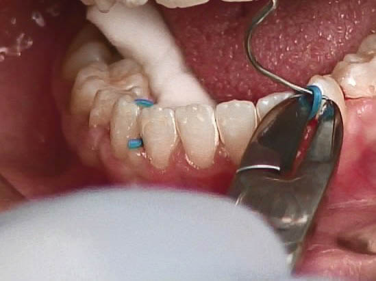 سیم را روی سینگلوم قرار دهید. اگر درون حفره دهان نیاُفتاد که مشغول چسباندن آن میشوید. اگر روی سینگلوم قرار نمیگیرد باید دو عدد سپراتور پلاستیکی بین دندانهای 2و3 دو طرف قرار دهید و سیم را از زیر آن رد کنید تا محکم به سینگلوم بچسبد (شکل 71-4). میتوانید دو سه قطعه نخ دندان بردارید و هرکدام را از کنتاکت بین دندانها رد کنید و سیم را بگذارید روی آن و بعد نخها را گره بزنید تا سیم در محل خود محکم شود.