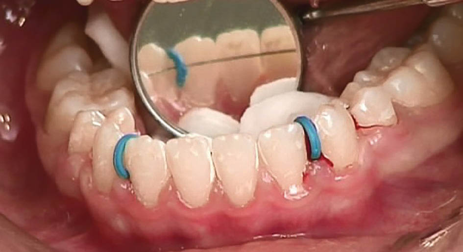 ابتدا سطح سینگلوم دندانها را با پودر اکسید آلومینیوم 50 میکرون سندبلاست کنید و سپس با اسید اچ و رزین سطح سینگلوم را آماده میکنید. رزین را اشعه بدهید تا کیور شود و بعد با کامپوزیت ارتودنسی سیم را به دندان متصل نمایید. خیلی مراقب باشید تا سطح دندان با بزاق آلوده نشود. بعد از کیور شدن برای خارج کردن سپراتور میتوانید آن را با نوک سوند از روی دندان بلند کنید و با قیچی یا کاتر آن را قطع کنید (شکل 72-4) و سپراتور را از لای امبراژور دندان خارج کنید.