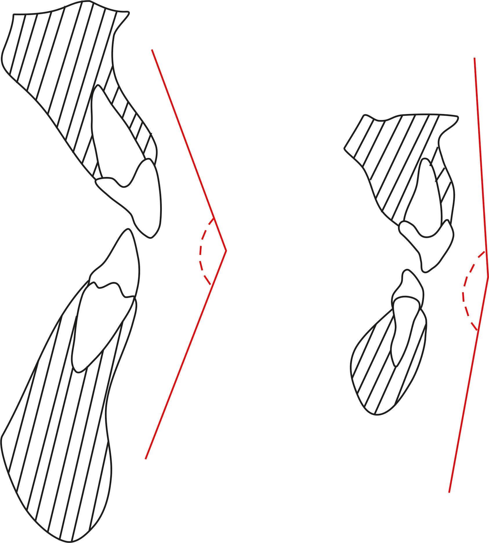 شکل 7-5 : انسیزورهای شیری uprightتر هستند (سمت راست) ولی انسیزورهای دائمی (سمت چپ) لبیالیتر و در قوس بزرگتری رویش مییابند.