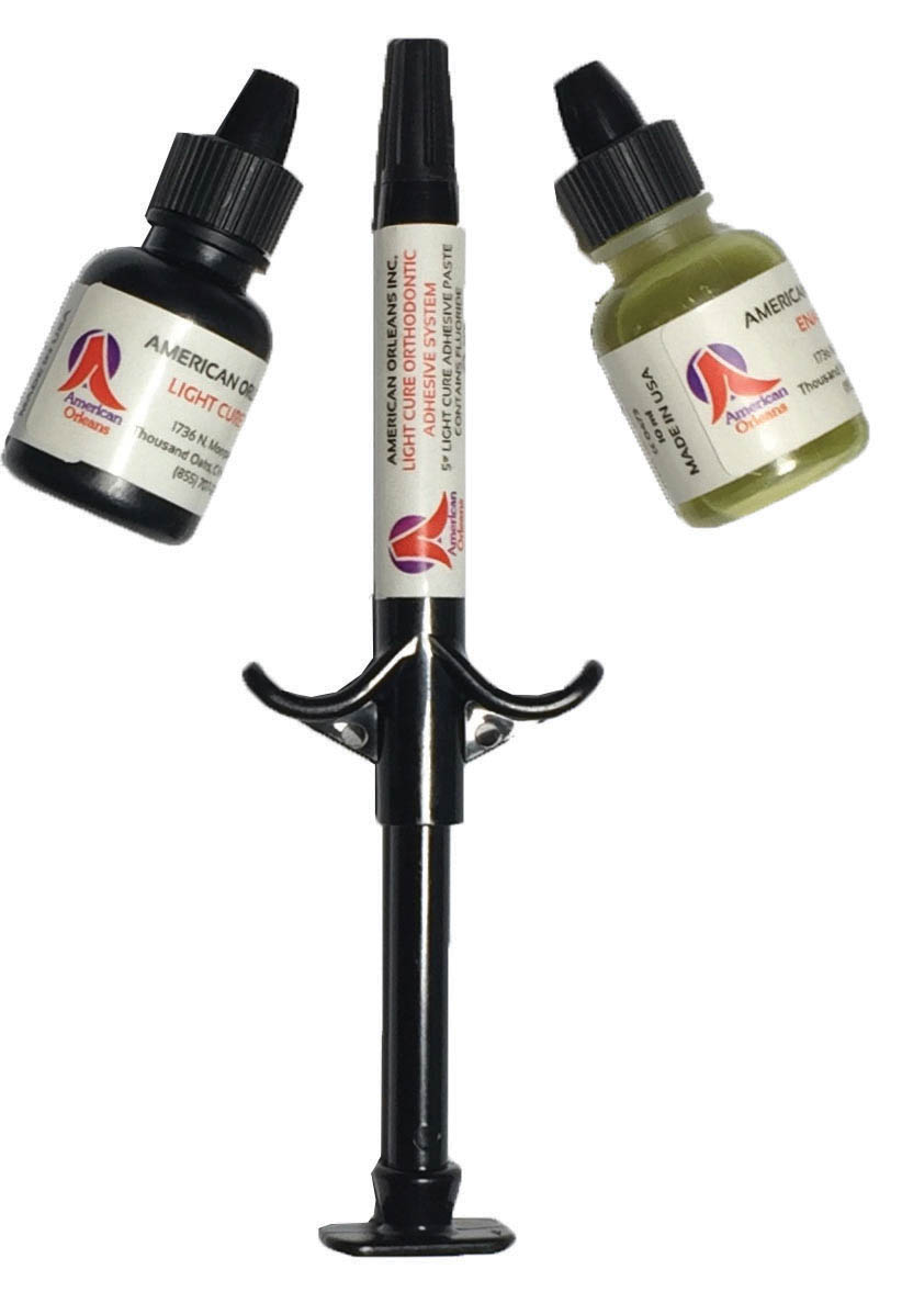 : یک تیوب کامپوزیت و یک بطری پرایمر دارد (شکل 81-1). بعد از اچ کردن سطح مینا پرایمر را به سطح دندان و کف براکت میزنید، سپس کامپوزیت را روی کف براکت اضافه نمایید و براکت را روی دندان منتقل میکنید، کل زمان کارکردن شما کمتر از یک دقیقه است (setting اولیه). بعد از تمیزکردن اضافات کامپوزیت از دور براکت، چهار دقیقه صبر کنید (setting نهایی) بعد آرچوایر را درگیر براکت نمایید.