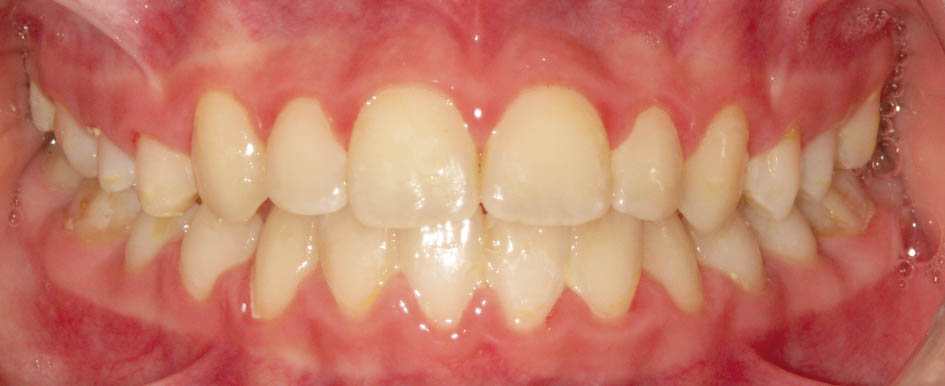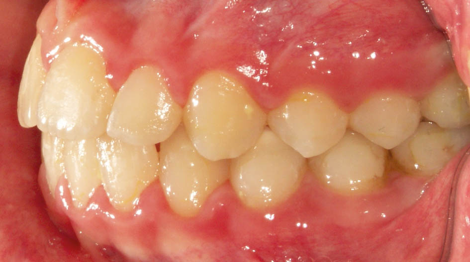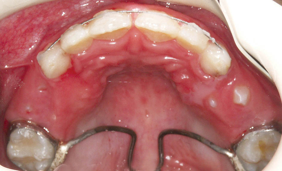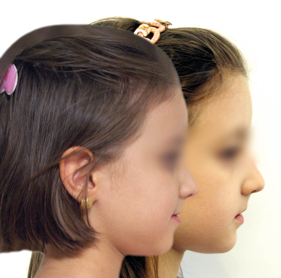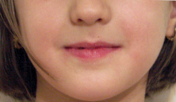 در این بیمار رشد پریماگزیلا و پروترود شدن انسیزورهای بالا باعث شد که لب بالا برجستهتر بشود و قرمزی آن بیشتر معلوم گردد.
