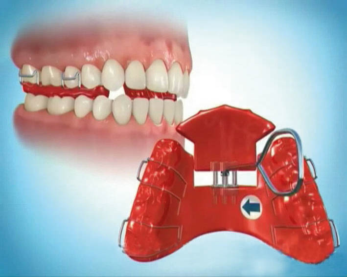 شکل 34-5: باز کردن پیچ قدامی منجر به پروترود شدن انسیزورها و رفع کراس بایت قدامی میشود