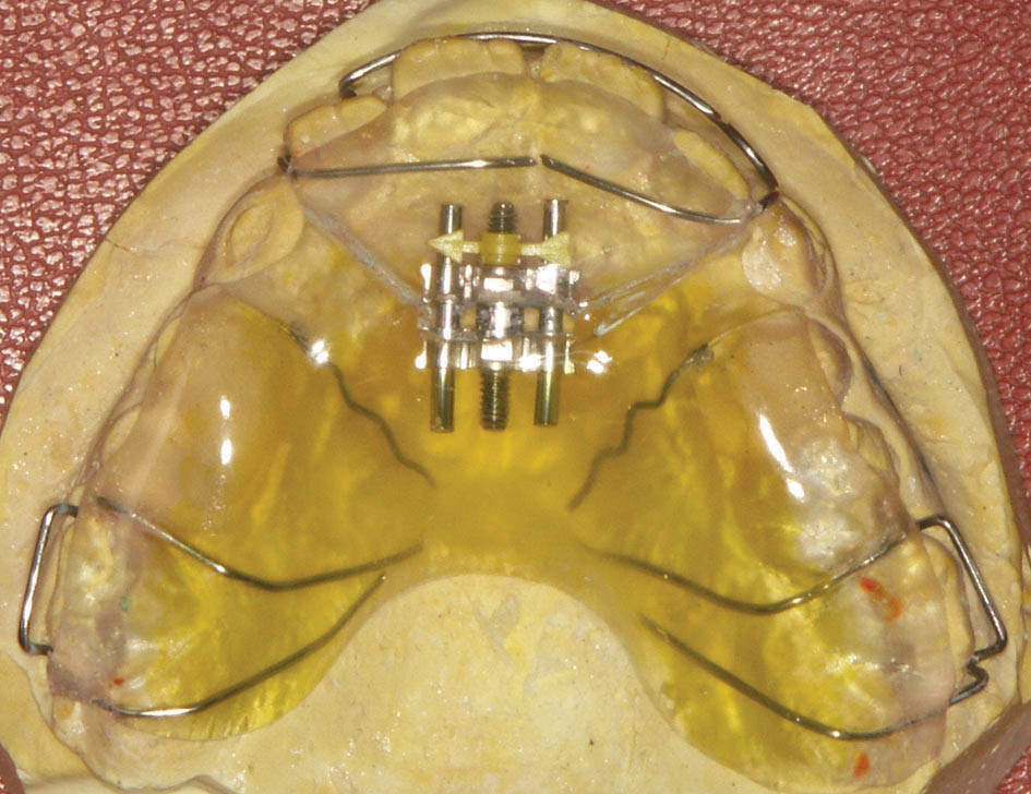 همانطور که ذکر گردید برای کراس خلفی یک پیچ RPE (شکل 41-5) بههمراه اسپیلینت پائین و برای کراس قدامی دندانها، چند براکت و یک اسپیلینت آکریلی پائین بسازید (اسپیلینت آکریلی پائین در هر دو درمان فوق مشترک است).