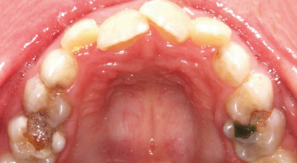 از آنجایی که دندانهای خلفی بالا تیلت پالاتالی ندارند(شکل38-5) و میدلاین دندانی و چانه بیمار (شکل39-5 و40-5) به چپ منحرف است به کراس دو طرفه و انحراف طرفی مندیبل پی میبریم.