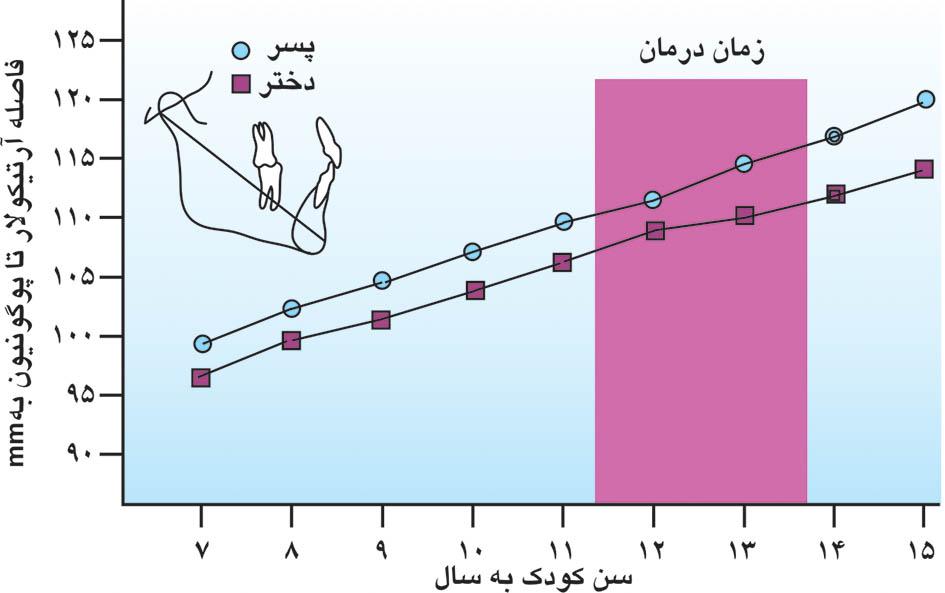 برای شروع درمان نباید به سن تقویمی بیمار اهمیتی بدهیم بلکه سن دندانی مهمتر است. در بعضی از بیماران در یازده سالگی تمام دندانهای دائمی وجود دارند و در بعضی دیگر دندانهای دائمی در سیزده سالگی رویش مییابند. رشد افراد قابل پیشبینی نیست اما تحقیقاتی که در زمینه رشد انجام گرفته نشان میدهد که بین سنین 11 تا 13 سالگی میزان کافی رشد برای درمان فانکشنال وجود دارد (شکل 52-5).