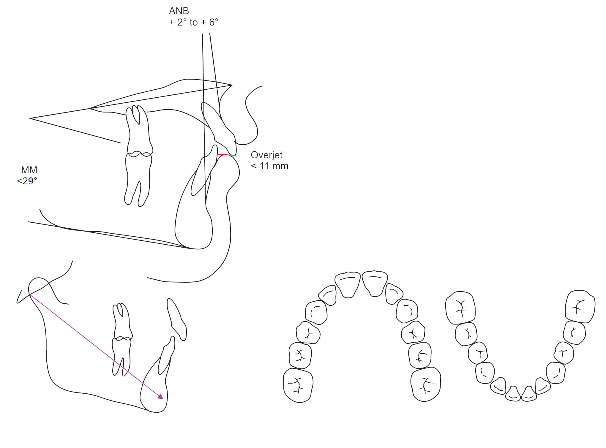 اگر زاویه بین دو فک (زاویه بین پلن ماگزیلا و مندیبل یا همان MMA) کمتر از 29 درجه باشد (مانند اکثر بیماران دیپ بایت) بیمار به درمان بهتر جواب میدهد (شکل59-5).
