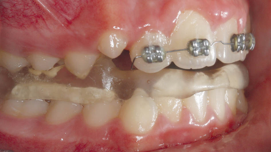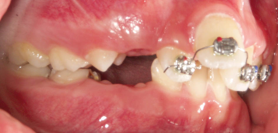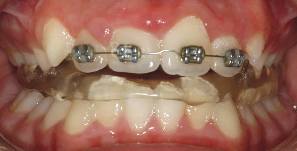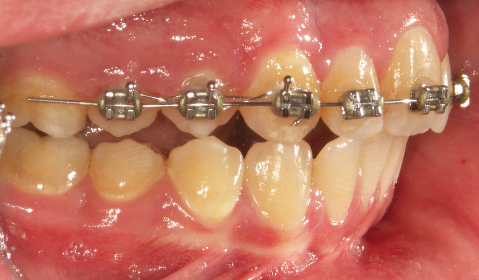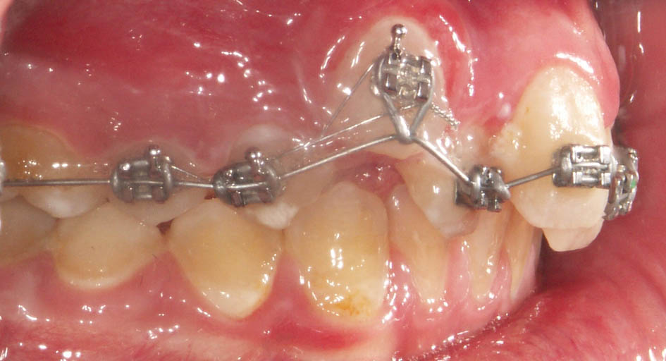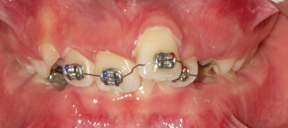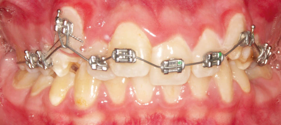 در این مواقع باید دندانهای قدامی را پروترود کنید. میتوانید یک پلاک آکریلی بسازید و Z Spring پشت قدامیها میگذارید یا چند تا براکت با یک سیم 0.012 سوپرالاستیک بگذارید. طبیعی است که گذاشتن چند براکت (شکل 74-5 و 75-5) خیلی سریع و در کمتر از 2 ماه جواب میدهد و نیاز به همکاری از جانب بیمار خیلی کمتر است.