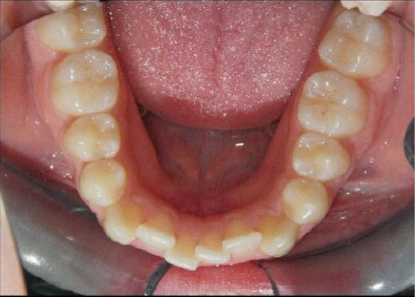 شکل 145-6 نحوه مرتب شدن دندانهای قدام پایین با 0.3mm استریپ هر کنتاکت را نشان میدهد. در پایان درمان قوس پایین کاملاً صاف شده است (شکل 146-6).