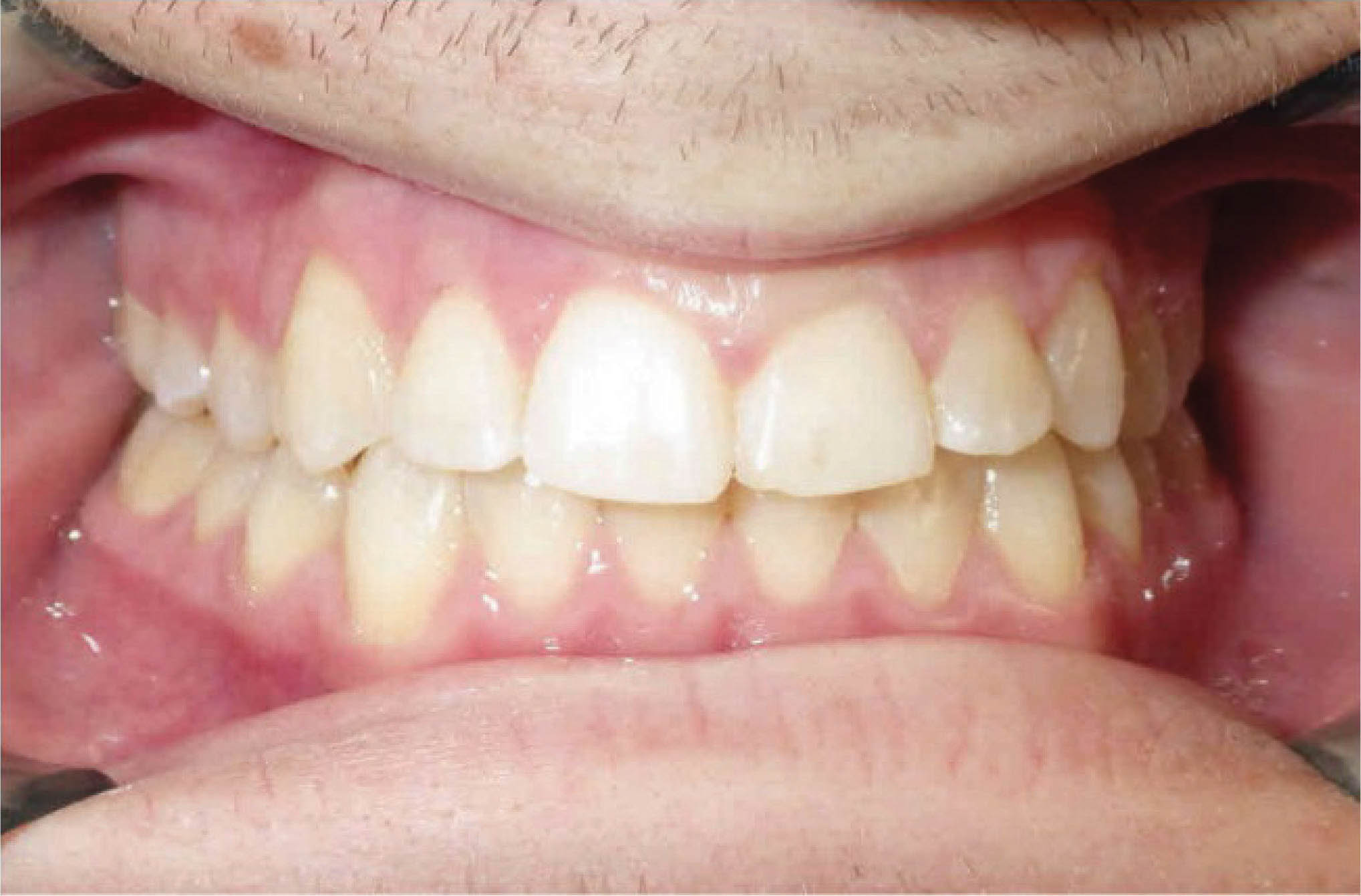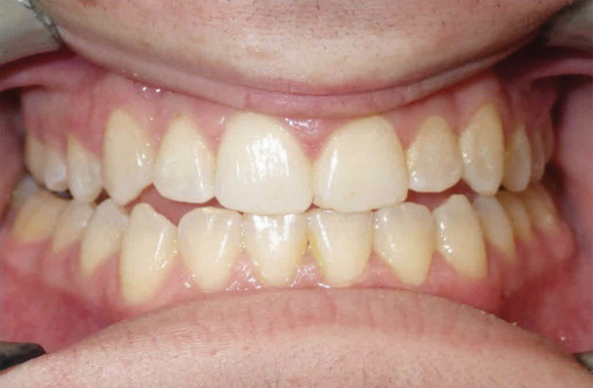 چهارمین کاربرد استریپ اصلاح تماسهای شدید اکلوزالی است. در بعضی از بیماران درمان شده با الاینرها با این حالت کلینیکی (شکل 150-6) روبرو میشویم. در این بیماران اپن بایت خلفی رخ میدهد. اکثر این اپن بایتها بخاطر تماس شدید دندانهای قدامی است. در چنین موارد باید از قدام پایین استریپ کنیم و آنها را عقب بکشیم تا این تماس قدامیهای بالا و پایین از بین برود. متعاقب این کار تماس دندانهای خلفی هم برقرار میشود (شکل 151-6).