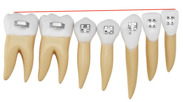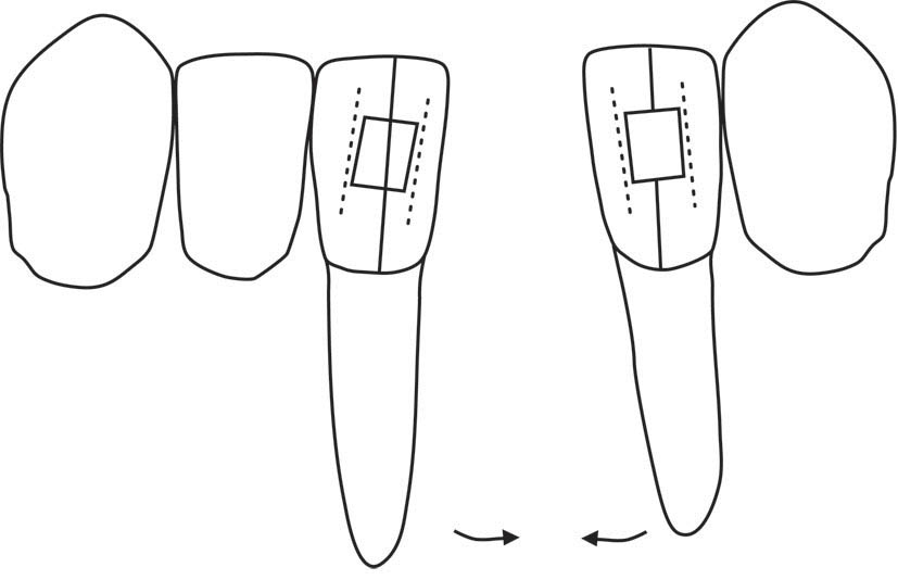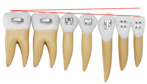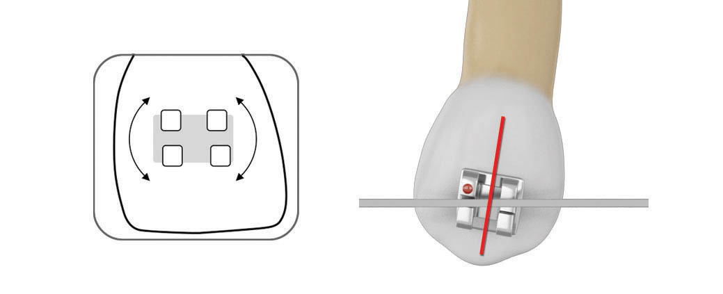 شکل 94-1: براکت دندانهای مجاور باید در ناحیه مزیال نیم میلیمتر ژنژیوالیتر شوند تا در انتهای درمان ریشهها موازی یکدیگر شوند.
