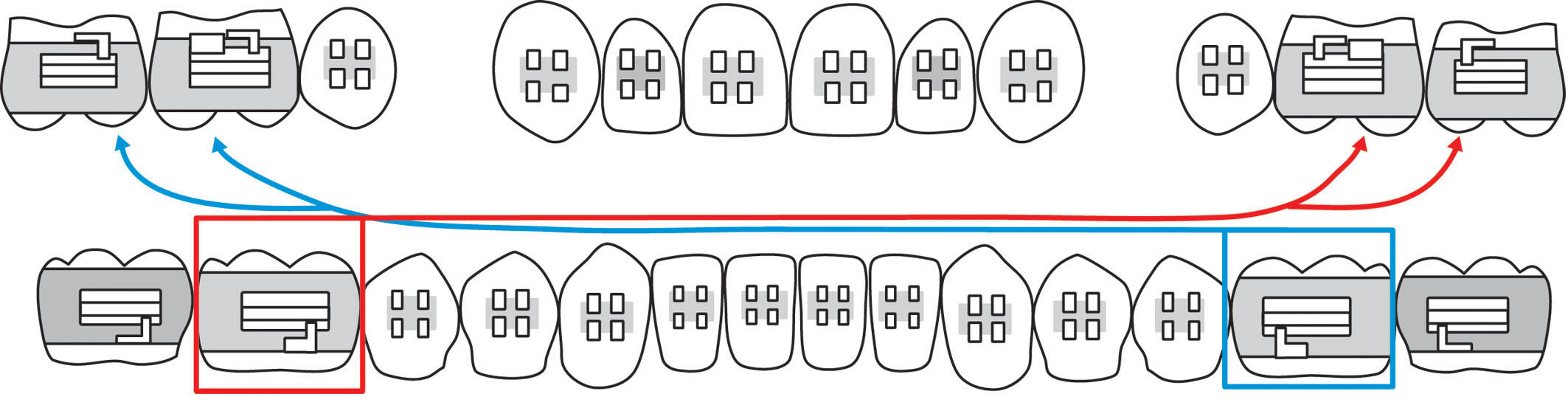 شکل 97-1: وقتی نتیجه درمان یک کاسپ کامل کلاسII است بهتر است از براکت مولر اول پایین سمت مخالف روی مولرهای بالا استفاده کنید تا رابطه بهتری بین مولرهای بالا و پائین برقرار شود.