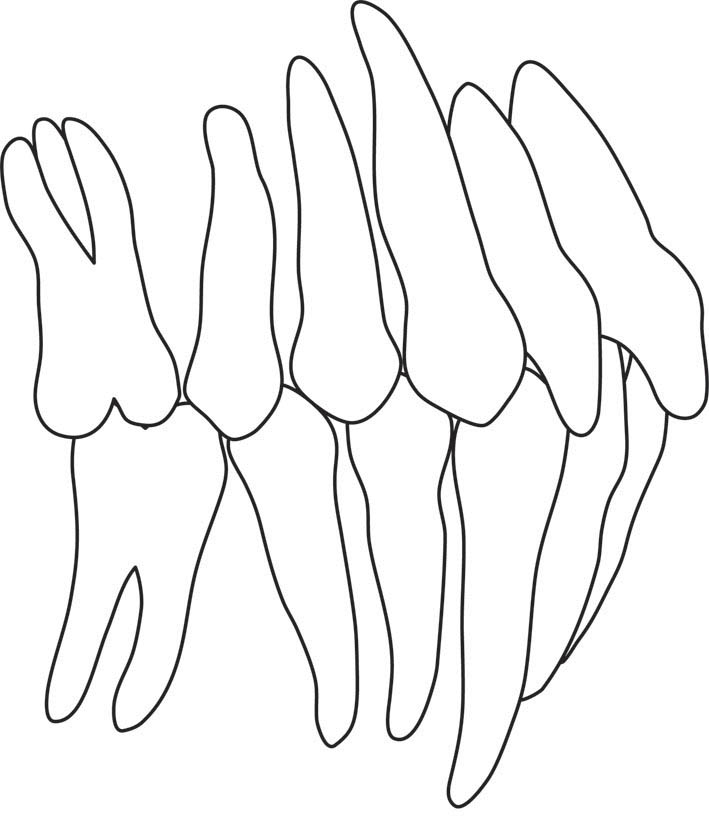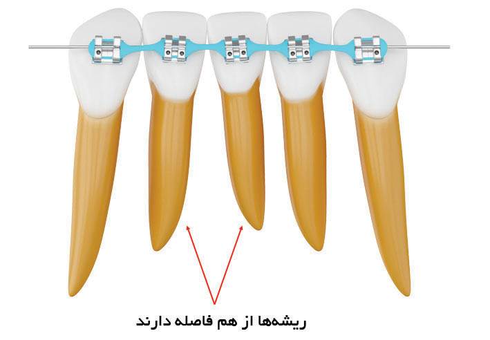 شکل 93-1: سانترال کشیده شده ولی براکت دندانهای مجاور موازی محور طولی چسبانده شدهاند لذا بعد از بسته شدن فضا ریشههای دندانهای مجاور از هم دور هستند.