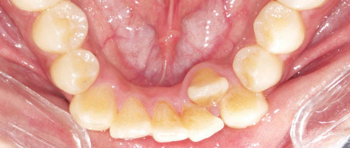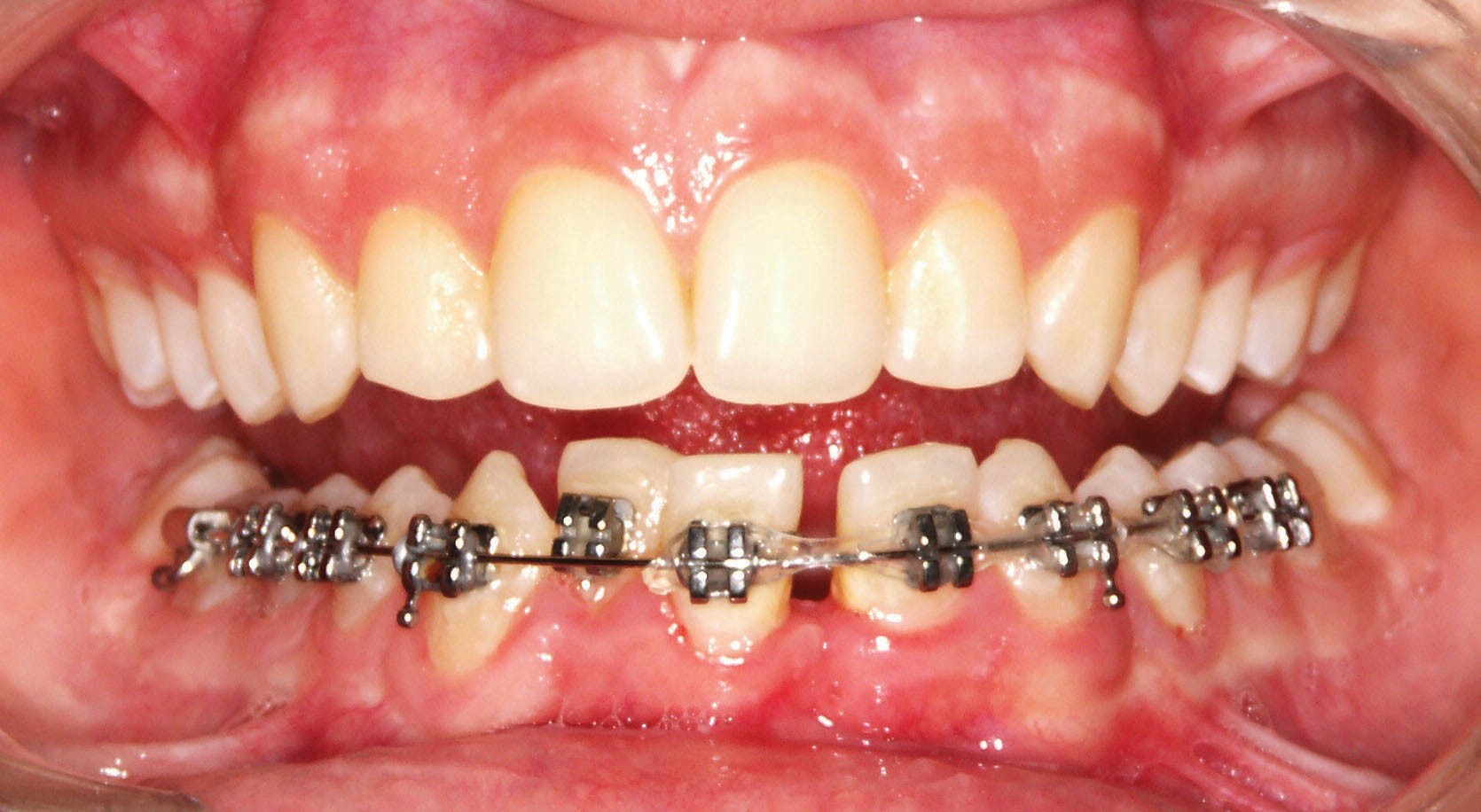 شکل 112-1: در بیمار کلاسIII انسیزورهای پایین رترود هستند. معمولاً نیاز به استفاده از الاستیک کلاسIII وجود دارد، لذا براکت انسیزورها را برعکس بچسبانید.