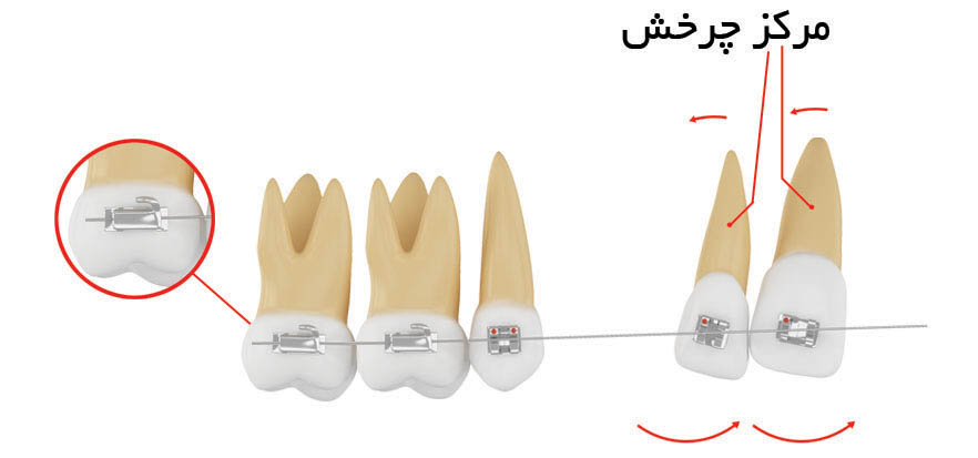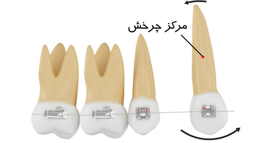 شکل 133-1: با زدن lace back مرکز چرخش به براکت منتقل میشود، لذا حرکت دیستالی ریشه بسیار بیشتر از حرکت مزیالی تاج میشود.