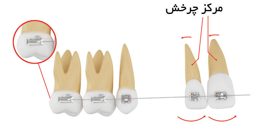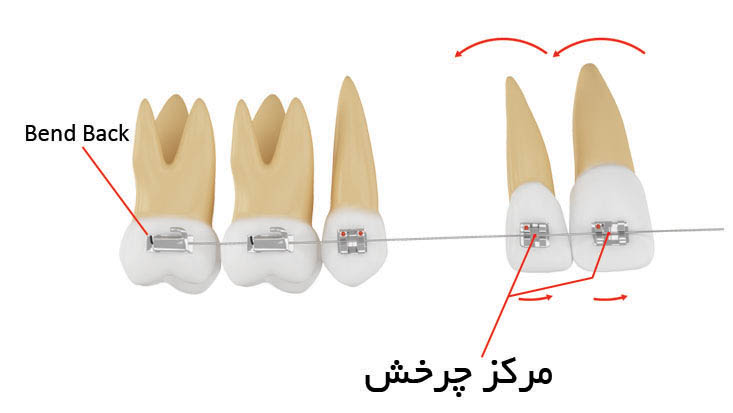با گذاشتن laceback مرکز چرخش دندان از حوالی مرکز ریشه به روی براکت منتقل میشود و پس از قرار دادن 0.012 سوپرالاستیک فقط میزان بسیار کمی از تاج مزیالی و مابقی آن تا انتهای ریشه دیستالی میشود.