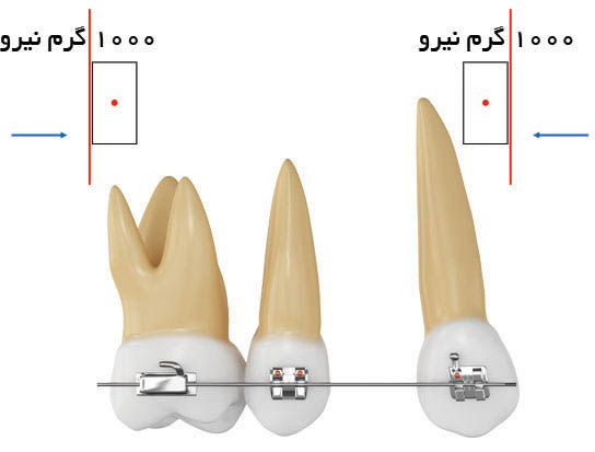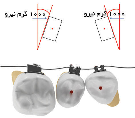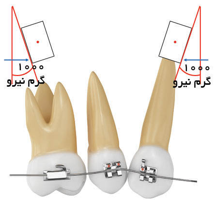 نیروی چین الاستیک بسیار زیادتر از نیروی آرچ وایر ابتدای کار است و به خاطر خارج از مرکز بودن نیرو، باعث دیستاله شدن تاج کانین و مزیاله شدن تاج خلفیها میشود (شکل 153-1).