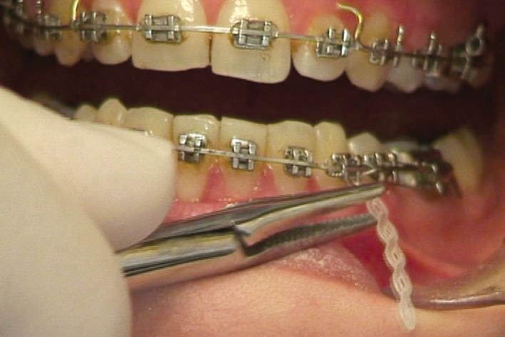 شکل 160-1: درگیر کردن یک حلقه از چین الاستیک به براکت لترال تا دندان به قوس فکی نزدیک شود.