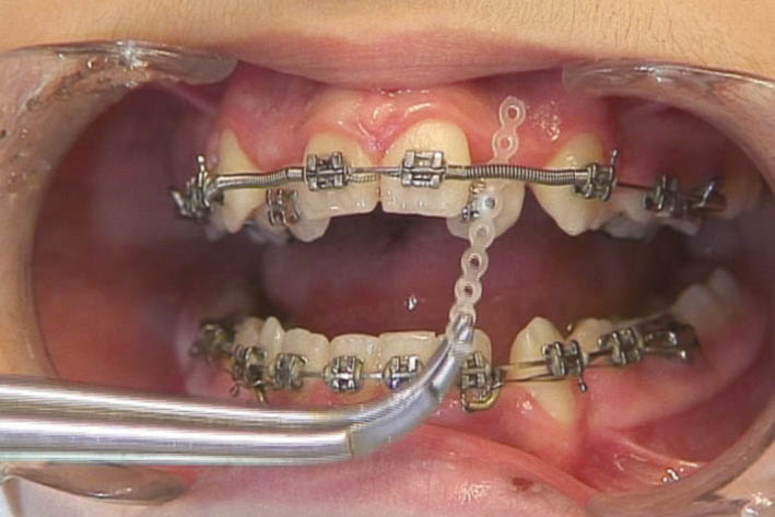 اگر استریپ قدامی کردهاید و فضا بین قدامیها ایجاد شده یا بین دندانهای قدامی Space وجود دارد میتوانید چینالاستیک را از براکت کانین تا کانین به مدت یک ماه بگذارید (شکل 156-1) اگر فضا بسته نشد هر ماه Chain Elastic را عوض میکنید تا سرانجام فضا بسته شود. بعد از بسته شدن فضا آن را برمیداریم و به صورت ضربدری از کانین تا کانین با سیم لیگاچور figure ∞ میزنیم تا فضا مجدداً باز نشود. بعد از اینکه فضا را بستیم اگر باز هم چینالاستیک بماند ایجاد کرادینگ میکند.