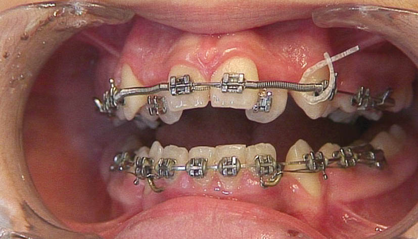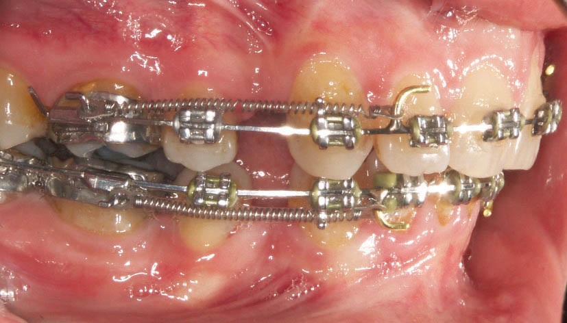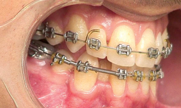 شکل 185-1: بعد از مرتب شدن تمام دندانها به غیر از لترال، فنر باز بین براکت سانترال و کانین قرار میدهیم تا فضا برای لترال ایجاد شود.