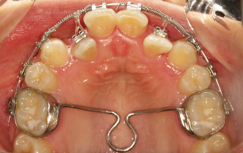 در بیماران به روش کشیدنی با استفاده از laceback دندان كانین را به دیستال حركت میدهیم تا فضا برای لترال پالاتالی فراهم شود. حركت دیستالی كانین باعث حركت مزیالی دندان 5 و 6 میشود. اگر حركت مزیالی دندان 6 مطلوب نباشد و هم چنین پروترود شدن سانترال نیز مد نظر باشد (اصلاح میدلاین یا اضافه کردن اورجت) به جای استفاده از laceback، از فنر استفاده میكنیم تا باعث جلو آمدن سانترال و عقب رفتن کانین به طور همزمان شود (شکل 185-1). به هنگام استفاده از فنر معمولاً