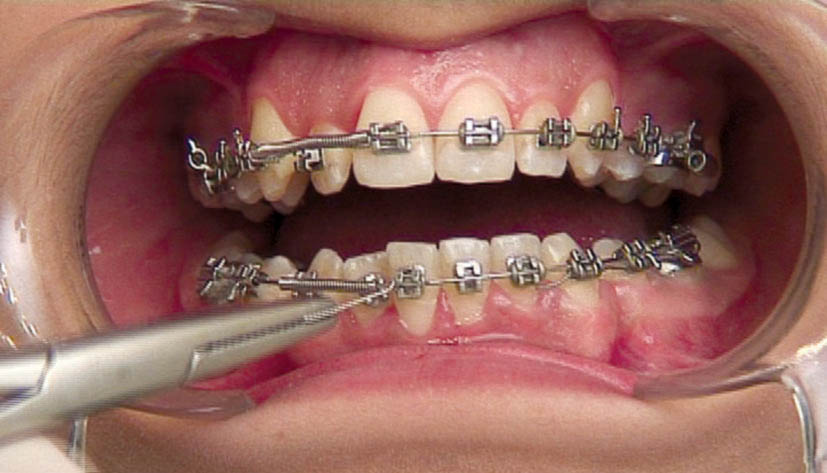 بعد از ایجاد فضا برای لترالهای پائین میتوانید سیم 0.012 را مستقیماً درگیر براکت لترال کنید تا درون قوس بیاید. برای لترالهای بالا وقتی فضا 1mm بیشتر از عرض لترال باز شد، قطعهای از chain elastic را بریده و دور آرچوایر قلاب کنید (شکل 190-1) و درگیر براکت لترال کنید تا نزدیک قوس فکی بشود.