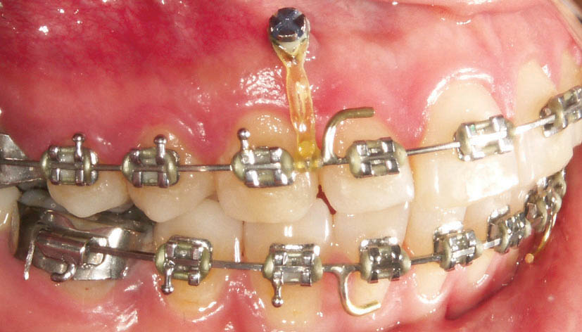 شکل 222-1: در بیمار gummy smile که دیپ بایت هم باشد مینی اسکرو در ناحیه لثه چسبنده بالای ریشه سانترالها میگذاریم تا سگمنت قدامی اینترود شود.