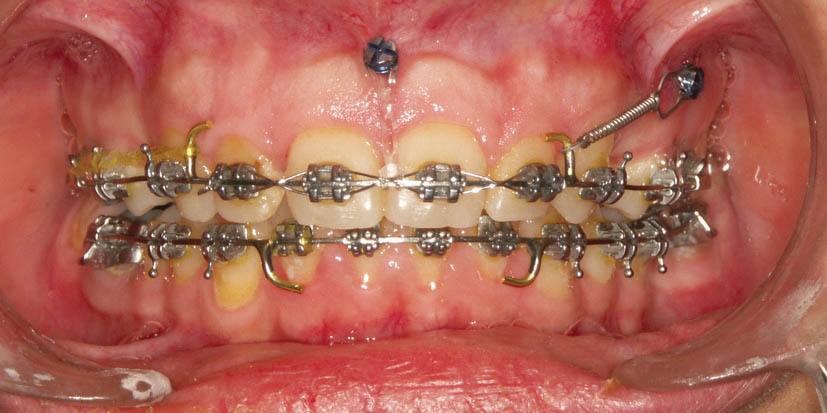 شکل 225-1: برای اینکه مانع مزیالی شدن خلفیها بشویم تمام نیروها روی مینی اسکرو اعمال گردید و سگمنت قدامی تمام فضای به دست آمده از کشیدن پرمولرها را استفاده نمود.