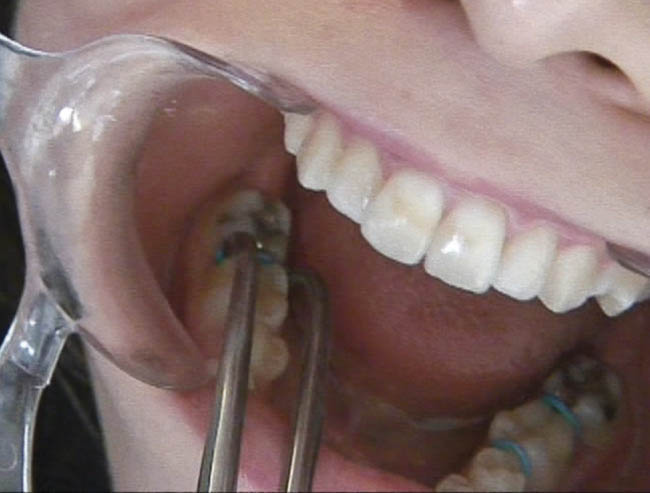 در سمت مزیال و دیستال مولر یک عدد آن را بگذارید تا بعد از یک هفته نقطه تماس باز شود. یک سمت سپراتور زیر کنتاکت و سمت دیگر بالای کنتاکت باید باشد (شکل 58-1) برای دندانهای قدامی هم سپراتور داریم که کوچکتر از خلفیها میباشند و در زمان استریپ قدامیها با فرز یا دیسک، باید از آنها استفاده کنیم تا نقطه تماس باز شود بعد استریپ کنیم.