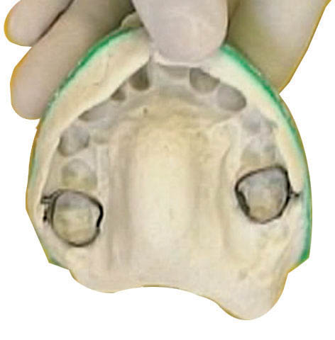 اگر نیاز به ساختن لینگوال آرچ یا پالاتالبار دارید (مثلاً برای جلوگیری از حرکت مزیالی مولرها و حفظ فضای E) باید بندها را در جایگاه خود بگذارید و با گیج ارتفاع آن را تنظیم کنید، بعد یک قالب pick-up از روی آنها با آلژینات میگیرید. سپس بندها را خارج و درون آلژینات میگذاریم (شکل 60-1) و گچ آن را میریزیم. بدینصورت بندها به روی کست گچی منتقل میشوند. حال این قالب را به لابراتوار بفرستید تا پالاتالبار یا لینگوال آرچ بسازند. بهتر است بندها را یک درجه بزرگتر بگیرید تا زمانی که به یکدیگر لحیم میشوند جازدن روی دندانها مشکل نشود.