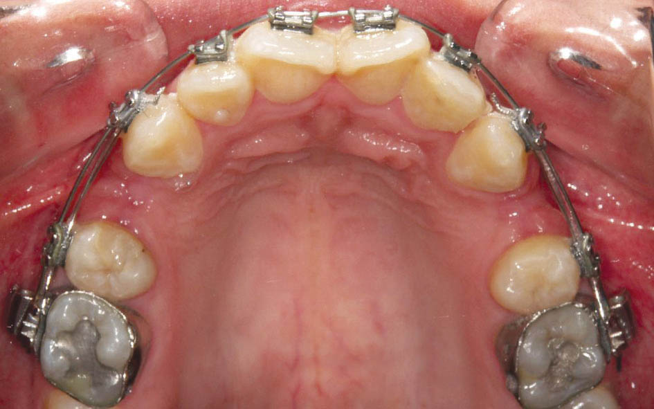این مرحله یک ماه بعد از سیم 0.019x0.025 حرارتی است. ماه بعد از قرار دادن سیم 0.019x0.025 حرارتی باید این سیم کاملاً در کف براکتها خوابیده باشد. اگر نخوابیده باشد (لترال شکل 3-3) باید سیم را با یخ سرد نمائید و کف براکت بخوابانید و بعد به جای اورینگ از وایر لیگاچور استفاده نمائید تا سیم در کف براکت بماند. یک ماه بعد اثر کامل سیم بر روی براکت و دندان را میبینیم. در این زمان باید دندانها کاملاً منظم و مرتب باشند. البته فرض بر این است که کامپوزیت اضافهای زیر براکتها نباشد وگرنه خود این حجم کامپوزیت منجر به نامرتب ماندن دندان میشود. اگر براکتها را اشتباه چسبانده باشید در این جلسه کاملاً مشخص میشود و باید به نحو زیر عمل نمایید: