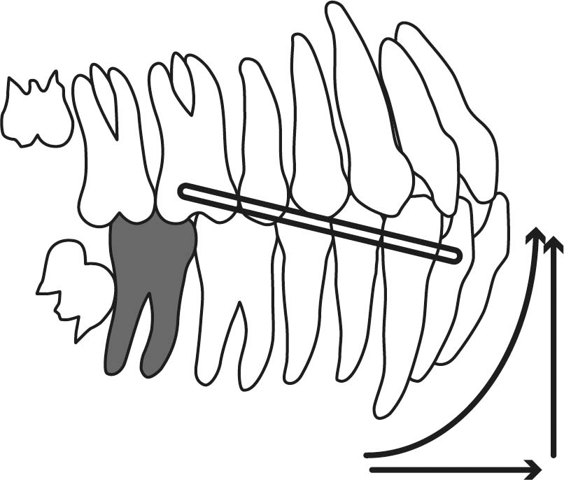 شکل 49-3: بعد از اینترود سگمنت خلفی بالا، مندیبل در جهت عکس عقربههای ساعت حرکت کرده تا تماس با بالا برقرار گردد، لذا کمی به سمت قدام پروترود میشود. کشیدن مولر دوم و استفاده از الاستیک کلاسIII برای رسیدن به اکلوژن کلاسI مطلوب است.