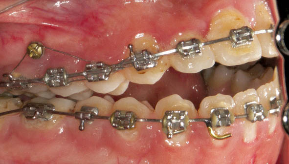 در بیمار اپن بایت (شکل 38-3 الی 40-3) در هر دو سمت چپ و راست یک مینی اسکرو در سمت باکال (شکل 41-3 الی 43-3) و یکی در سمت پالاتال (شکل 47-3) قرار میدهیم. آرچ وایری که میگذاریم را در ناحیه بین کانین و پرمولر اول قطع میکنیم تا دندانهای خلفی با قدامی روی یکدیگر اثری نداشته باشند. وقتی آرچوایر سه تکه باشد دندانهای سگمنت قدام و خلف جداگانه مرتب میشوند. چهار قطعه چین الاستیک از مینی اسکرو باکال به براکت دندانهای پرمولرها و مولرها میاندازیم. چون گردن مینی اسکروها برای چهار قطعه چین الاستیک کوچک است، لذا یک سیم لیگاچور از درون این چهار قطعه چین الاستیک رد میکنیم و آن سیم لیگاچور را به مینی اسکرو درگیر میکنیم تا یک نیروی اینترود کننده روی سمت باکال سگمنت خلفی اعمال شود. از سمت پالاتال هم چند باتن میچسبانیم و همین کار را در سمت پالاتال انجام میدهیم. البته در شکل 41-3 الی 43-3 دندانها در سمت باکال زیادتر از سمت پالاتال اینترود شدند، لذا سمت باکال با سیم لیگاچور به مینی اسکرو وصل شده تا در همان وضعیت بماند.