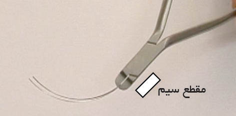 نحوه قرار دادن سیم کرو دار بالا و پایین به صورت شکلهای 58-3 و 59-3 باید باشد. وقتی سیم بالا را با یک پلایر Tweed بگیرد دسته پلایر به سمت بالا و وقتی که سیم پایین را با یک پلایر Tweed بگیرید دسته پلایر به سمت پایین میشود. دسته پلایر نشان میدهد که مقطع سیم به نحوهی است که باعث باکالی شدن تاج انسیزورها میگردد (شکل 60-3).