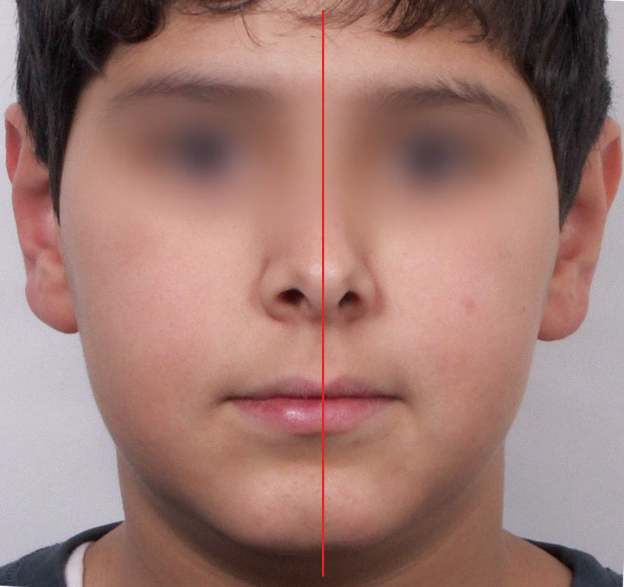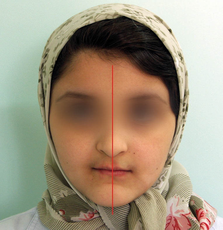 شکل 99-3: انحراف میدلاین دندانی به راست به خاطر کرادینگ بیشتر سمت راست