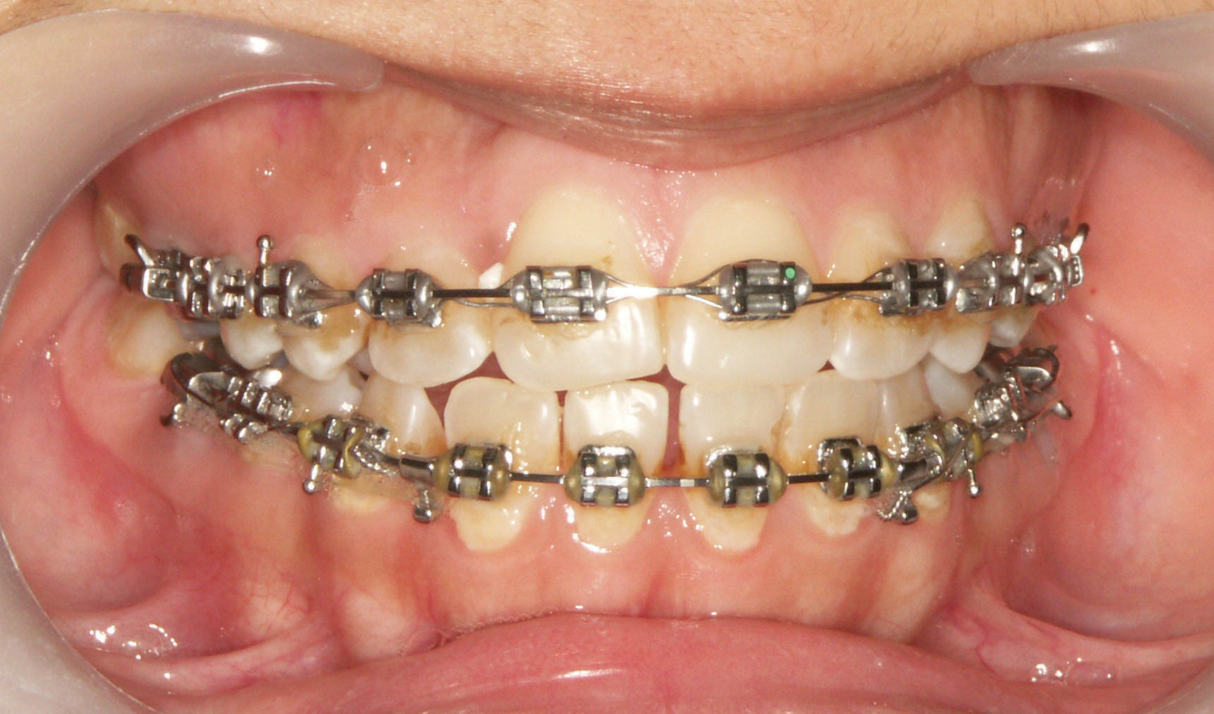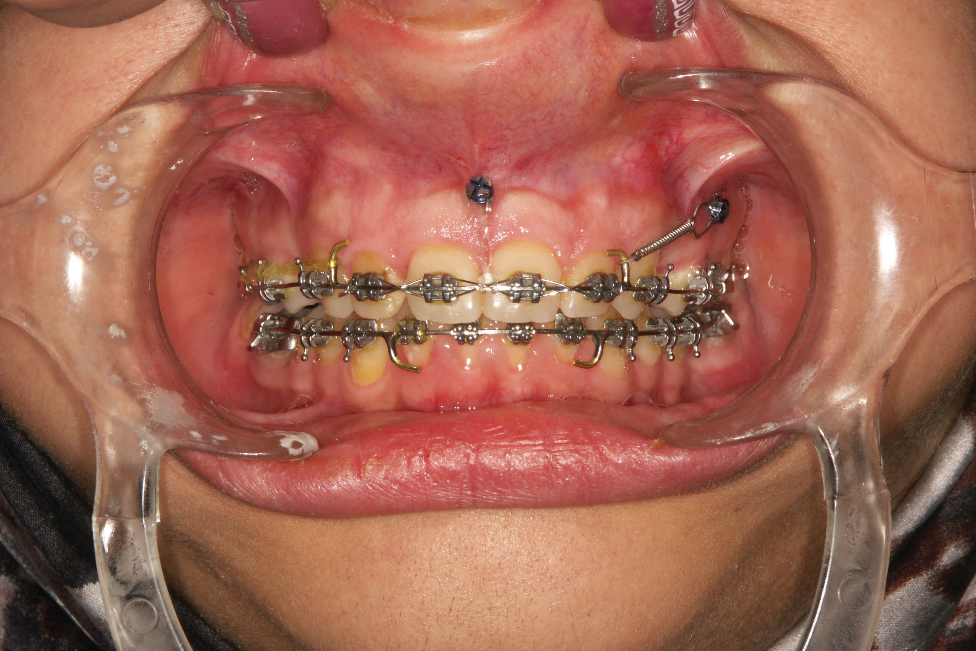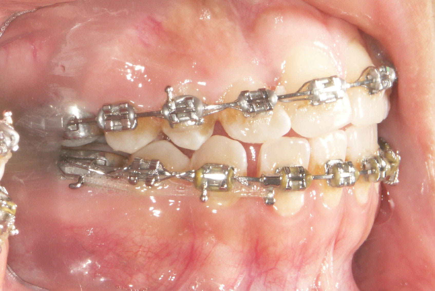 شکل 20-4: ∞figure بالا مانع ایجاد فضا شده است ولی در فک پائین چون ∞figure ندارد و هوکها هم به دیستال براکت لترال تماس ندارند فضا ایجاد شده است.