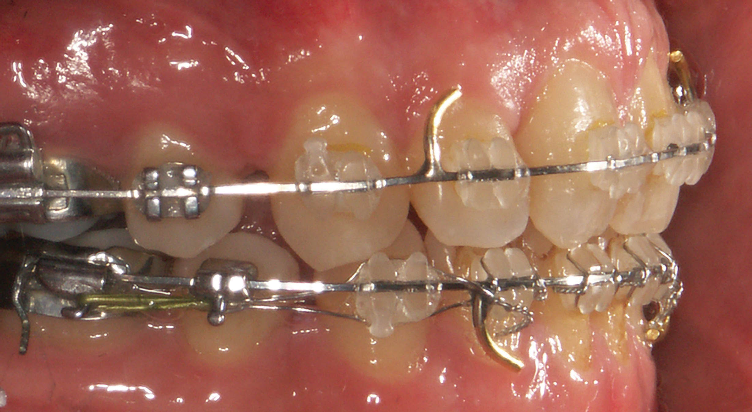 اگر در زمان 0.019x0.025 حرارتی با سیم لیگاچور براکت قدامیها را figure∞ نکنید یا در زمان 0.019x0.025 استیل، فاصله هوک سیم زیاد باشد (شکل 19-4 و20-4) و هوک با دیستال براکت لترال تماس نداشته باشد (شکل 21-4) آن موقع بین انسیزورها فاصله میافتد. برای بستن آن مجبور به استفاده از چند قطعه چین الاستیک از کانین تا کانین خواهید شد تا این فضا بسته شود. چین از کانین تا کانین بگذارید و حتماً براکت کانین را وایر لیگاچور نمایید تا مانع چرخش دندان کانین شوید. بعد از یکی دو جلسه تعویض چین که ماهانه انجام میشود حتماً براکتهای قدامی را با سیم لیگاچور figure∞ نمایید تا دوباره فاصله نیفتد.