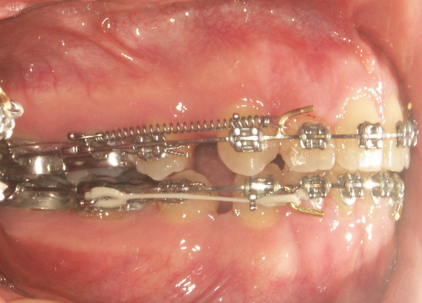 مورد اصطکاکی مانند زمانی است که چند قطعه چین الاستیک را از دندان مولر اول یک سمت تا سمت دیگر قرار میدهید. هر حلقه را مانند یک اورینگ روی یک براکت میگذارید و میکشید تا حلقه بعدی به براکت بعدی برسد. بدین صورت چین الاستیک کشیده میشود و به مرور زمان که میخواهد جمع بشود و به حالت اول برگردد باعث بسته شدن فضا میگردد. در این حالت سیم ثابت است و دندانها روی آن حرکت میکنند تا فضاها بسته شود. اصطکاک فراوانی بین براکت و سیم رخ میدهد، لذا برای بستن فضا باید از نیروی زیادی استفاده نمایید تا مقداری صرف غلبه بر اصطکاک و مابقی برای بستن فضا خرج شود. این حالت برای ناحیه قدام زمانی که بین قدامیها فضا وجود دارد خوب است مثلاً بیمار با Spacing قدامی مراجعه میکند یا شما یک انسیزور پایین او را کشیدهاید. ابتدا سیم اولیه را میگذارید و بعد از مرتب شدن اولیه دندانها، شروع به ضخیم نمودن سیم در هر ماه میکنید تا به سیم استیل برسید، بعد دندانهای پایه که معمولاً کانینها هستند را با سیم لیگاچور محکم ببندید و چند قطعه چین الاستیک از کانین یک سمت تا کانین سمت دیگر بیاندازید تا فضا بسته شود. برای اینکه کانینها مزیاله نشوند Laceback نیز بزنید.